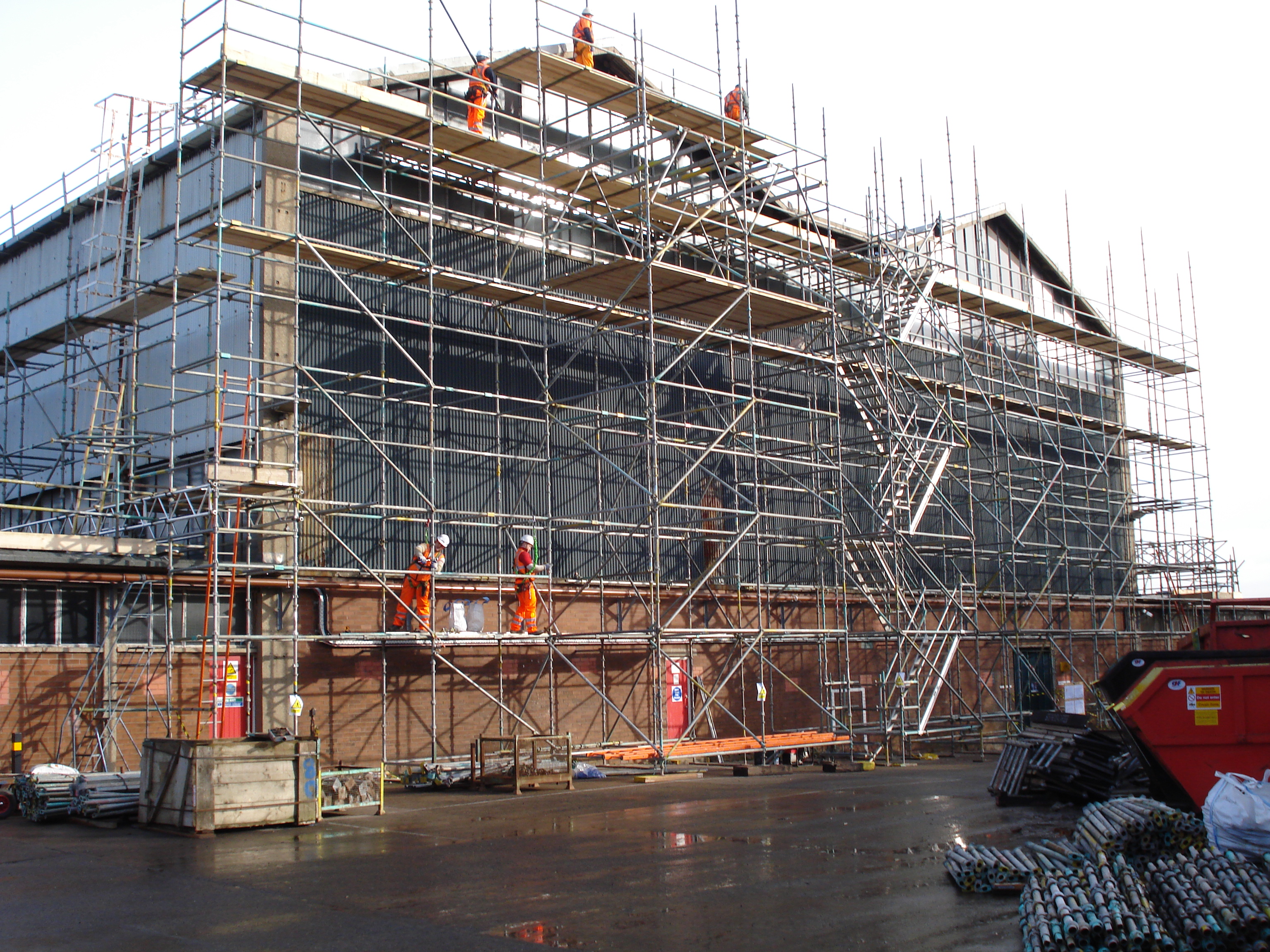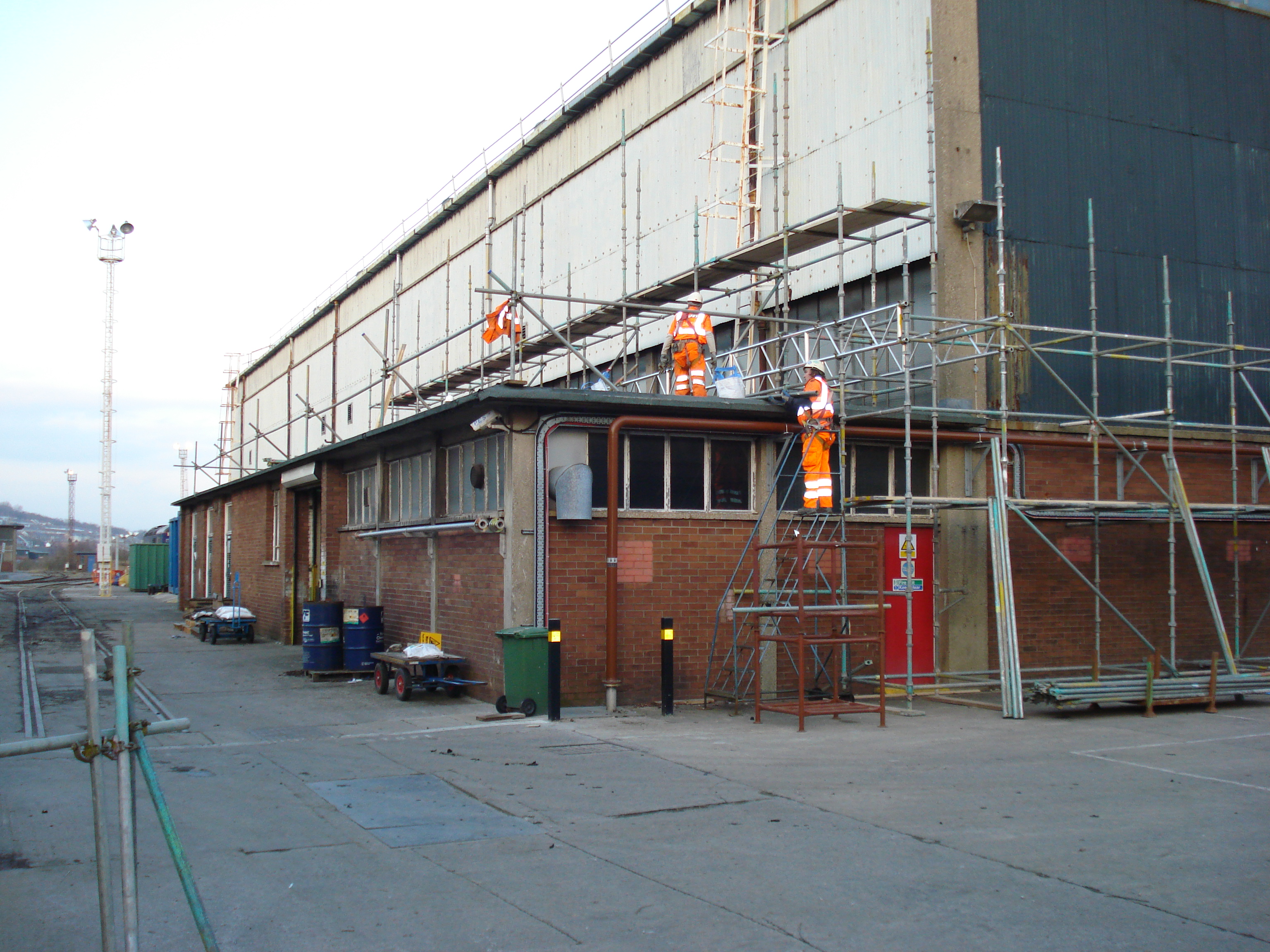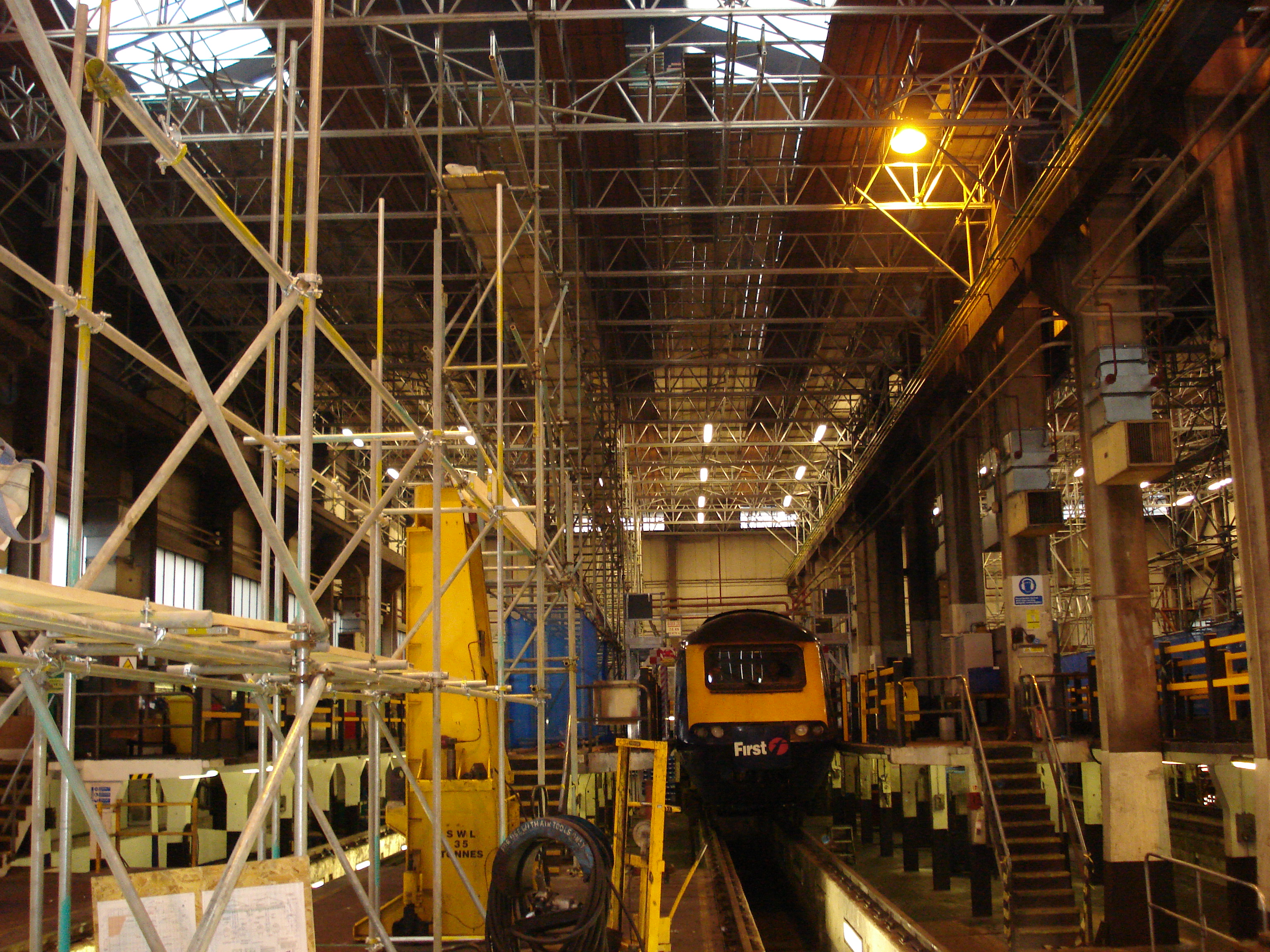 TR Scaffolding were awarded the contract to provide external and internal access to facilitate the works. The internal installation comprised of a 66 metre long x 30m wide crash deck situated 10m above the ground. The deck was formed with a 5 degree slope, a water proof membrane and a guttering system to fully weather protect the valuable trains and maintenance equipment below. A external scaffold surrounding the perimeter of the building which measured in total 200m long x 10m high provided the necessary safe edge protection to compliment the internal scaffold. The entire project was installed within 5 weeks with teams working shifts around the clock.