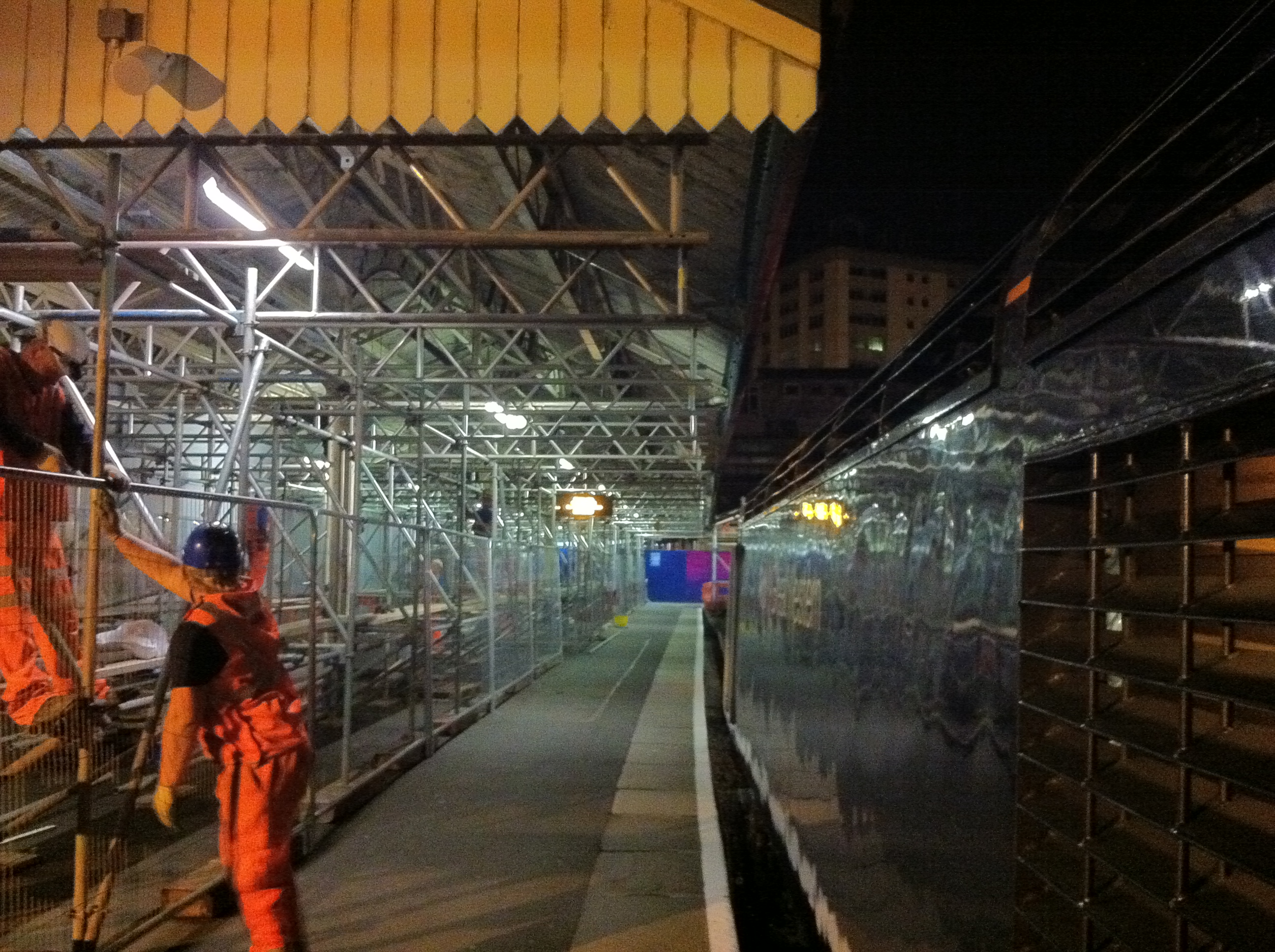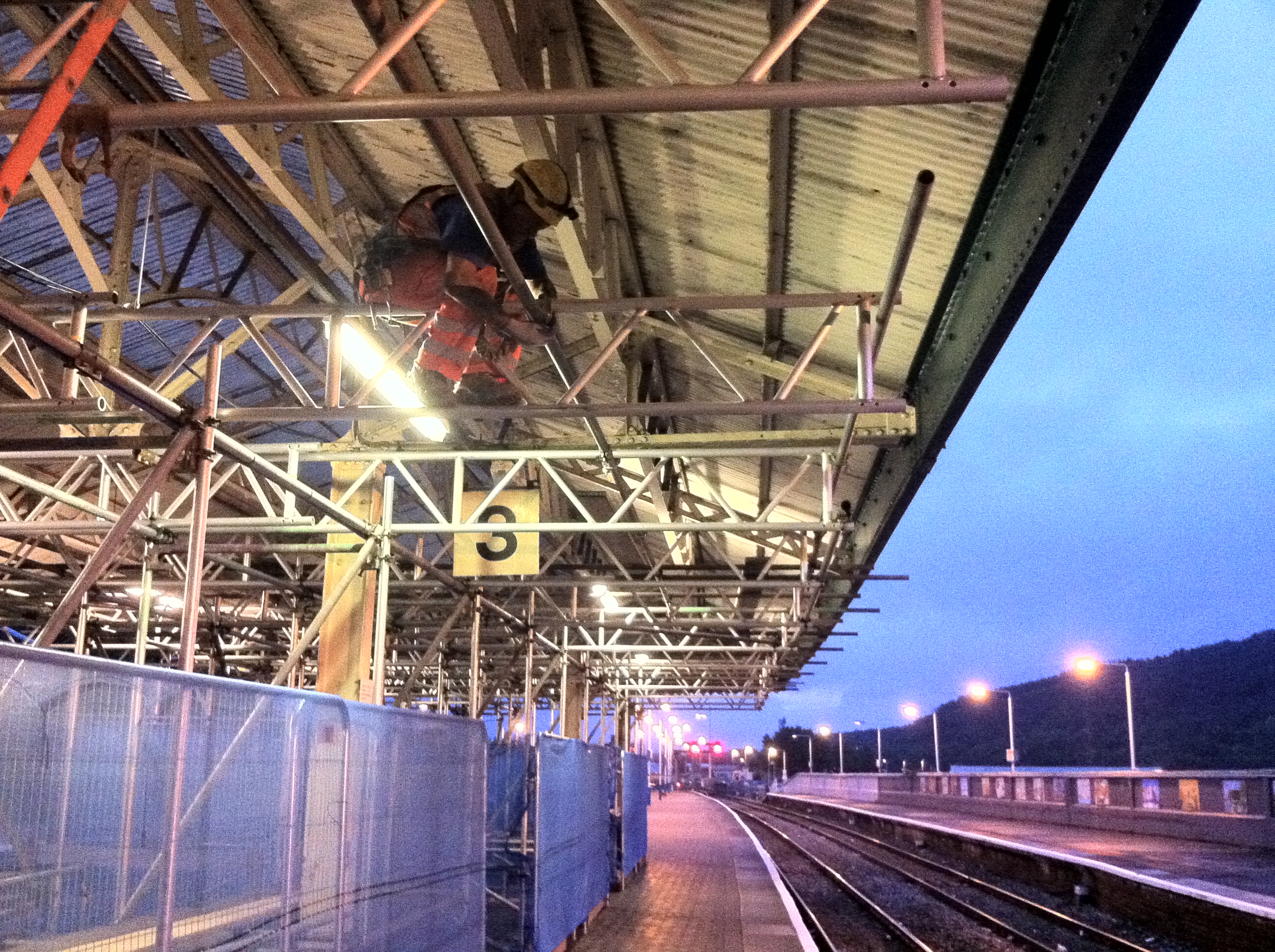 Swansea Railway Station required an access scaffold crash deck to the underside of the canopies on each of the four platforms.